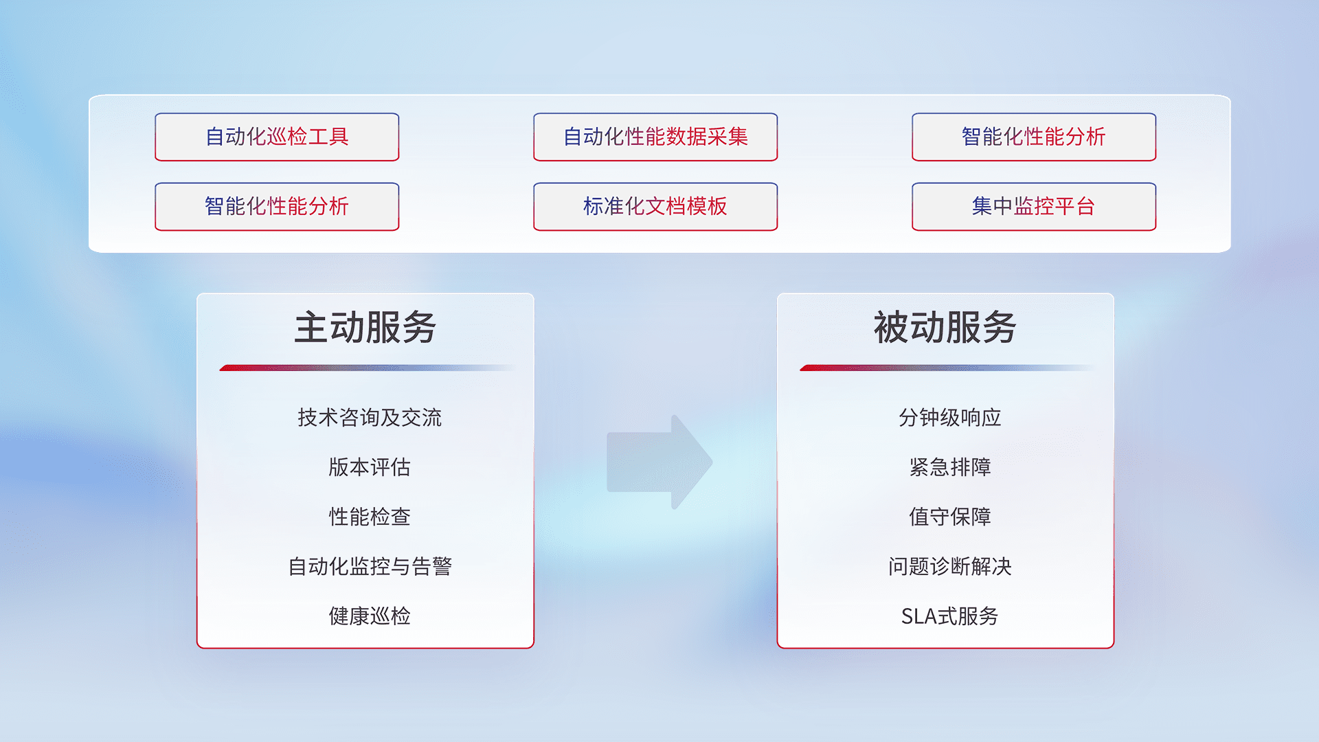 智能化工具和标准化文档,,,保障服务质量,,提供主动服务(包含技术咨询、、、版本评估、、、性能检查、、、自动化监控与告警、、、健康巡检)和被动服务包含(分钟级响应、、、紧急排障、、、值守保障、、、问题诊断解决、、SLA服务)。。。